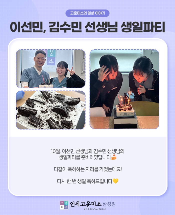 고운미소의 일상 이선민, 김수민 선생님 생일파티 작성자 삼성고운미소치과 작성일 2025-11-02 13:56 조회 715 좋아요 0 싫어요 0 인쇄 « 내부교육(상담) 전체 세미나 » 목록보기