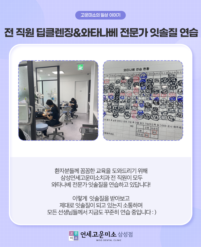 고운미소의 일상 삼성점 전 직원 딥클렌징&와타나베 전문가 잇솔질 연습 작성자 고운미소-삼성 작성일 2023-05-23 11:31 조회 17713 좋아요 0 싫어요 0 인쇄 « 한양여대 치위생과 병원 견학 및 현장 답사 삼성연세고운미소치과 5월 대청소 후 스타벅스까지! » 목록보기